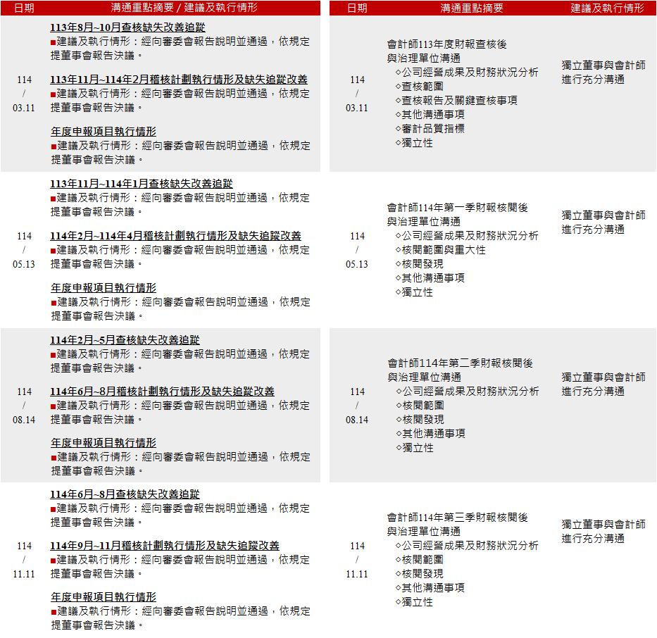 審計委員會旨在協助董事會於公司執行有關稽核、財務控制、會計與財務報導等之時,作為重要的監督角色。