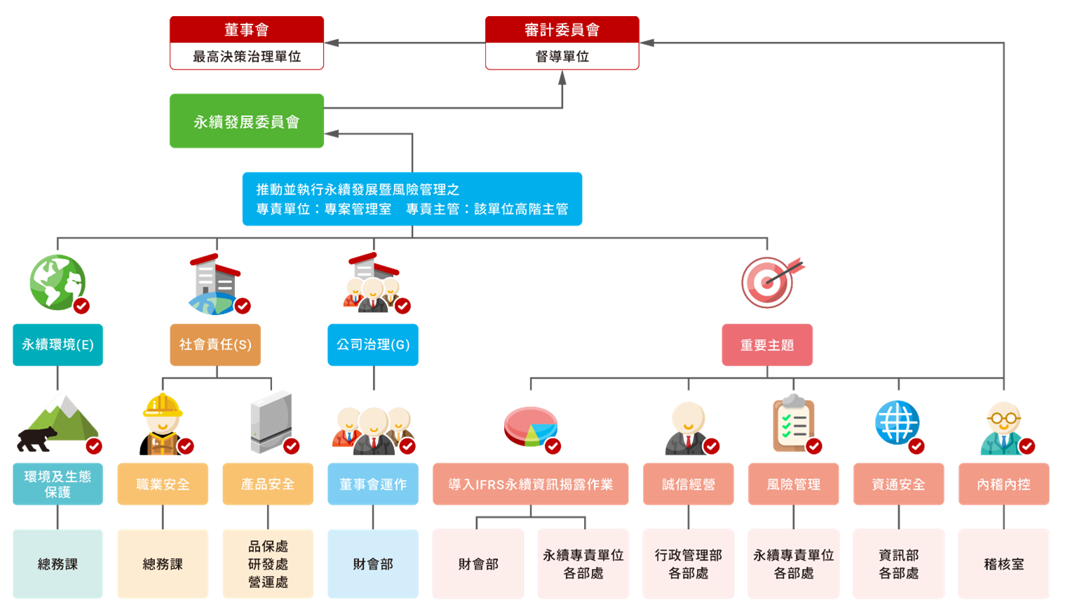 營)、風險管理、資訊安全管理等工作事項。由各工作小組負責鑑別需關注之永續議題、推動並落實執行、審查並追蹤執行成果﹐