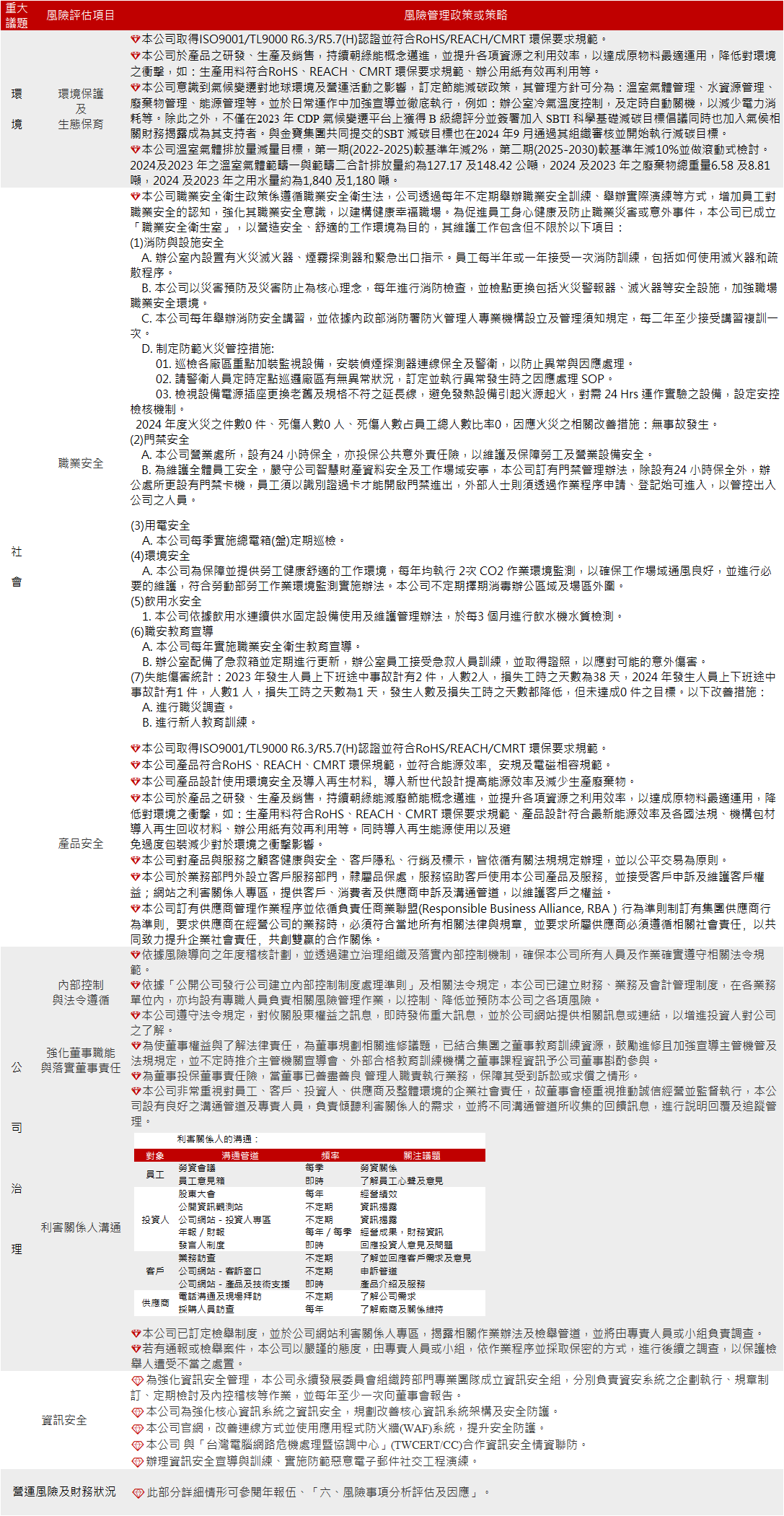 ➤ 本公司依重大性議題進行風險評估後採取的風險管理政策或策略,請參閱下表: